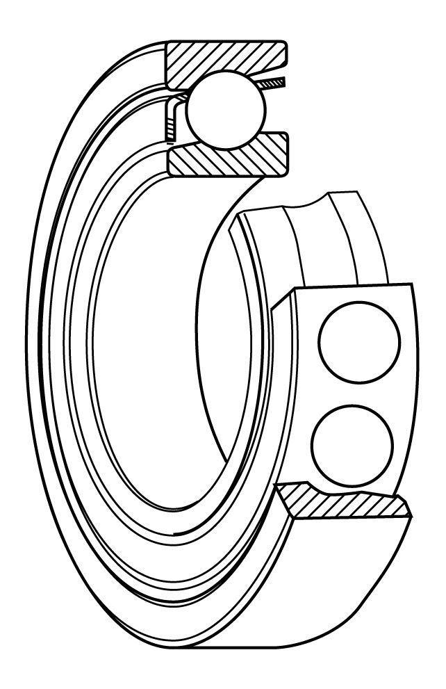 Ca trong của loại vòng bi này được ghép lại từ hai phần. Thiết kế này cho phép một vòng bi có thể chịu được tải dọc trục đáng kể theo cả hai chiều.